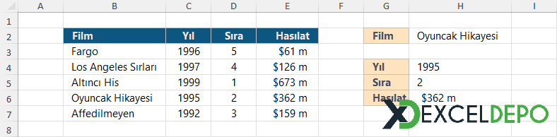 Dosyamızda, bir film listesinde olan verilere göre arama yapılması örneklendilmiştir. Başlangıç düzey Excel kullanıcılarına yönelik bir arama bulma örneğidir.| YARARLI KISAYOLLAR | |