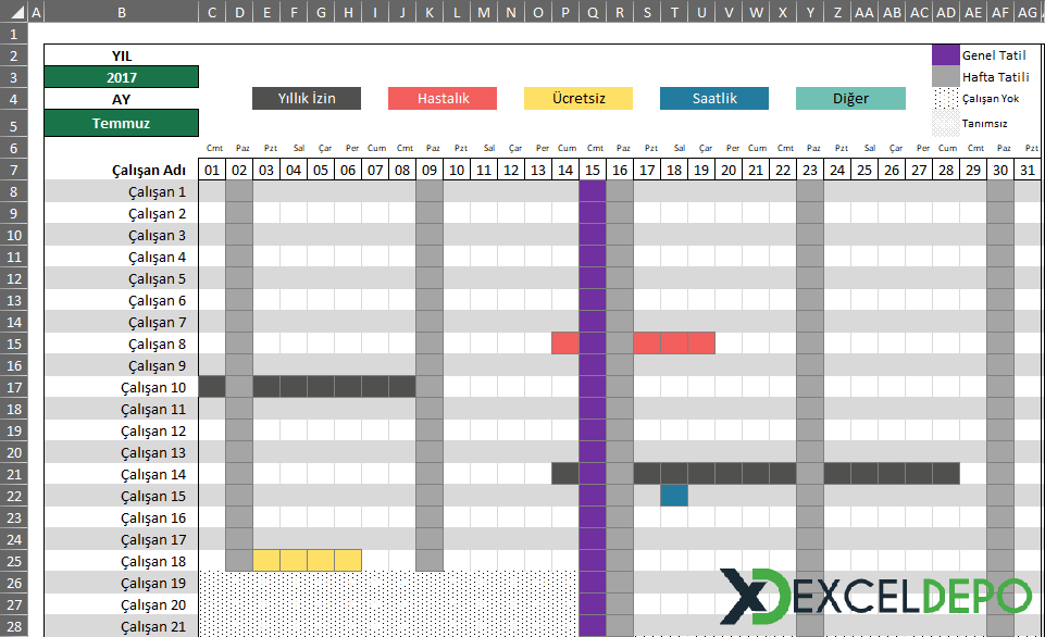 Bu dosya ile yıllık tatil tanımlamalarınıda yaparak, tatil günlerine denk gelecek olası izinleri kolayca dashboard üzerinde görebilirsiniz.